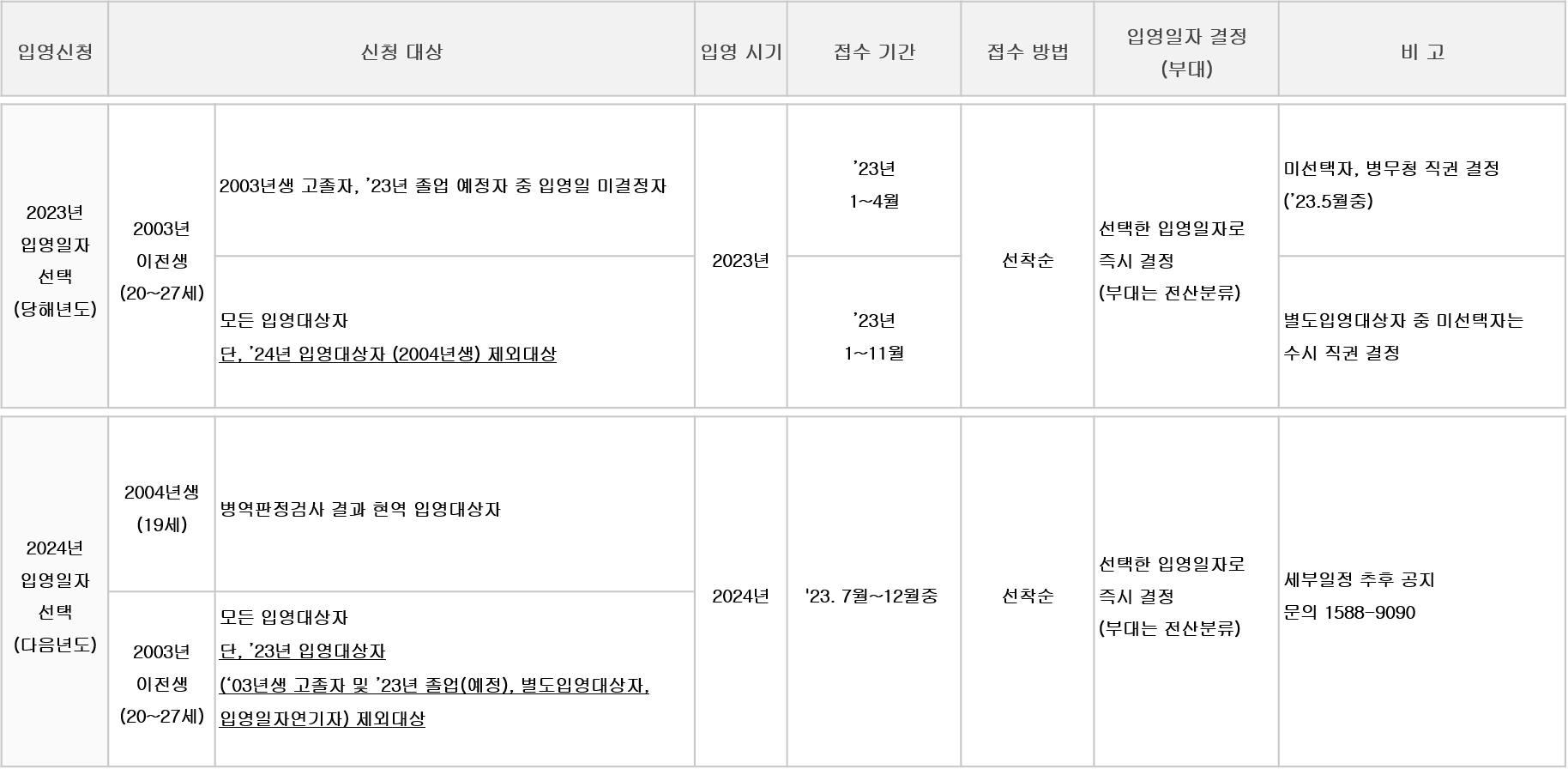 ① 현역병 군입대, 입영신청 : "현역병입영 본인선택원 바로가기"을 통해 다음연도 혹은 당해연도 입영일자 선택 가능